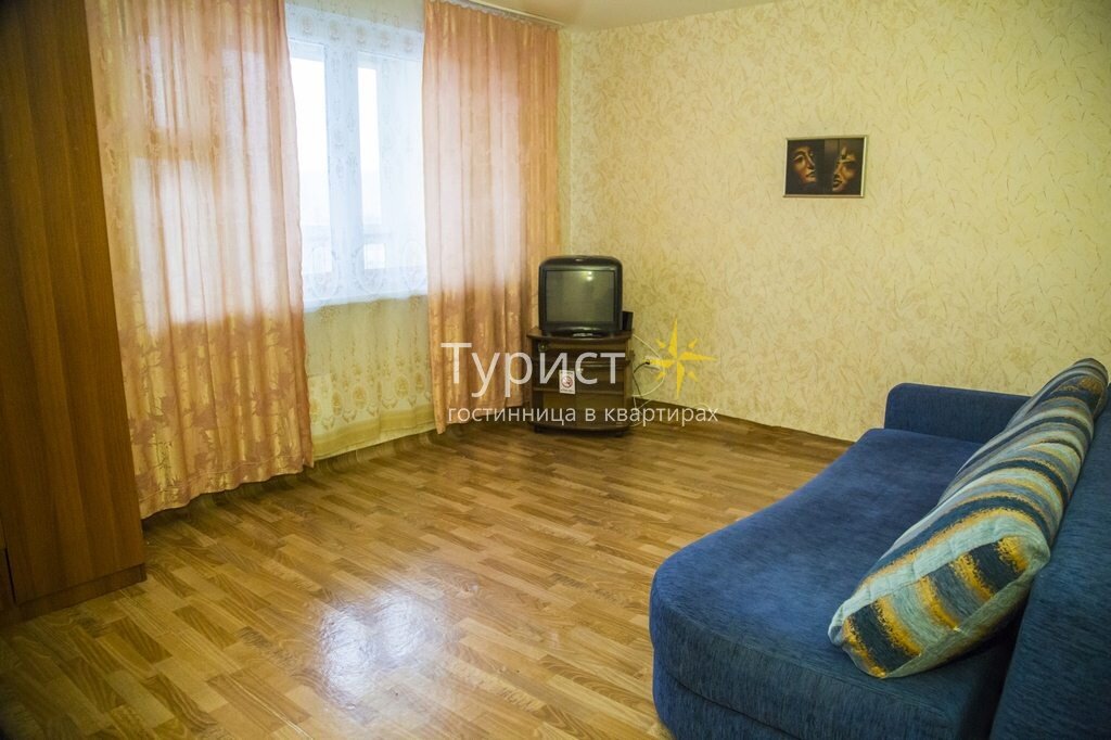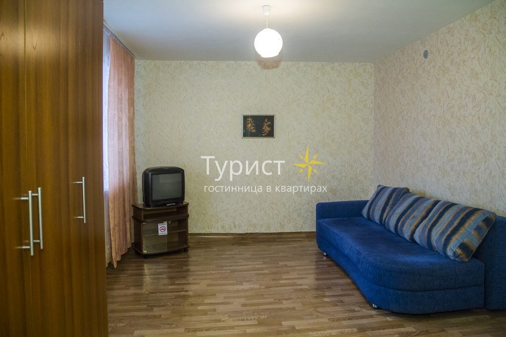 Спальное место – большой раскладной диван, который подарит вам мягкость и проведет в сладкий мир грез. Напротив, на тумбе стоит небольшой телевизор,